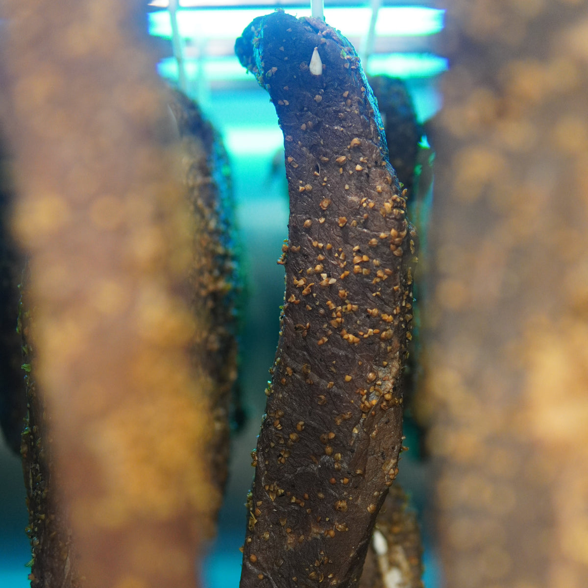 You'll know it's ready when it's shrunk to about half its original size, firm to the touch but still slightly bendy, and turned a rich, deep shade of maroon. In proper South African shops, you'll find whole slabs hanging from rafters, windows, and anything sturdy enough to bear its weight. Just walk in, pick your piece, get it sliced, and carry it home in a brown paper bag.